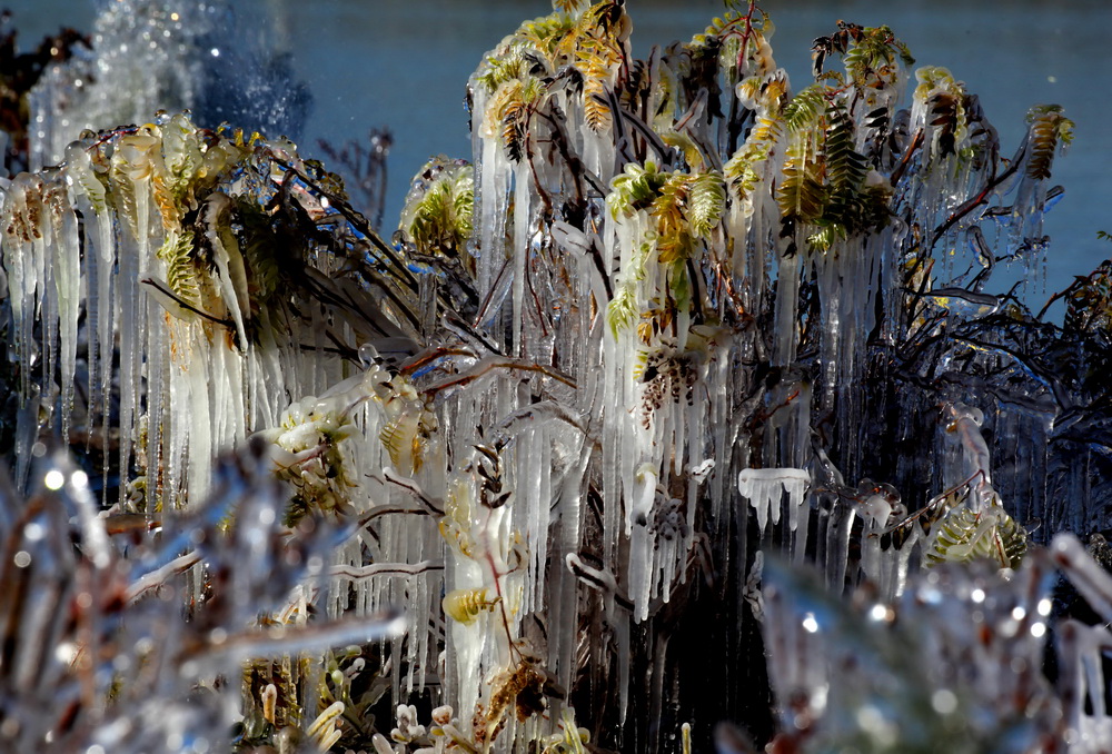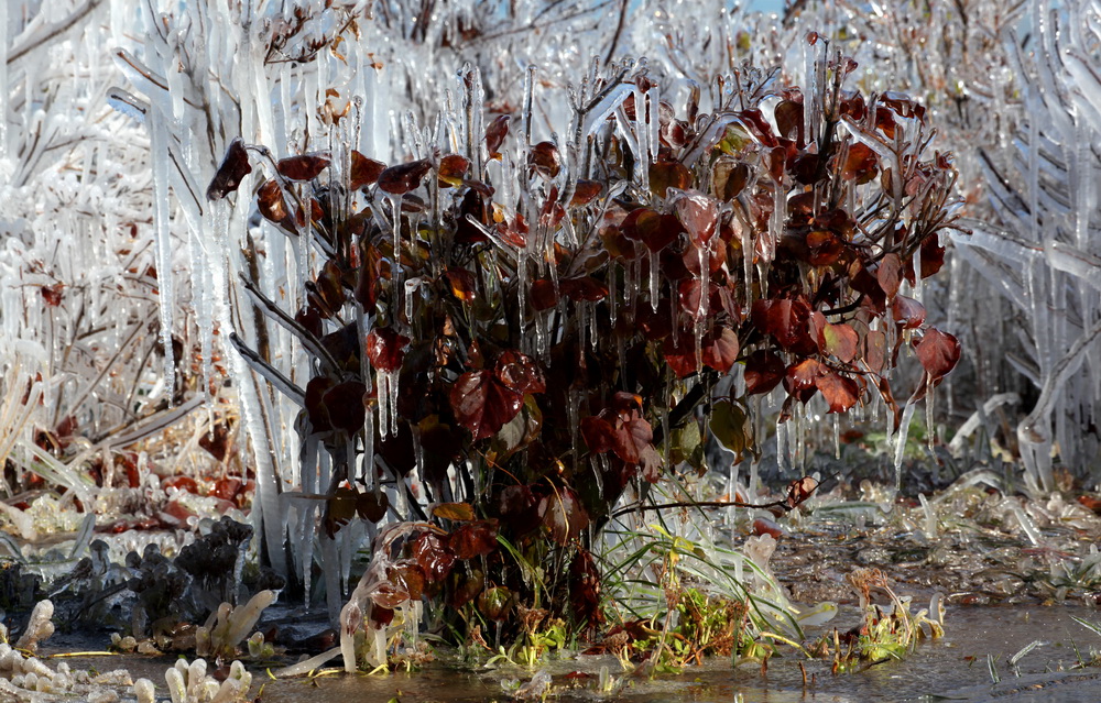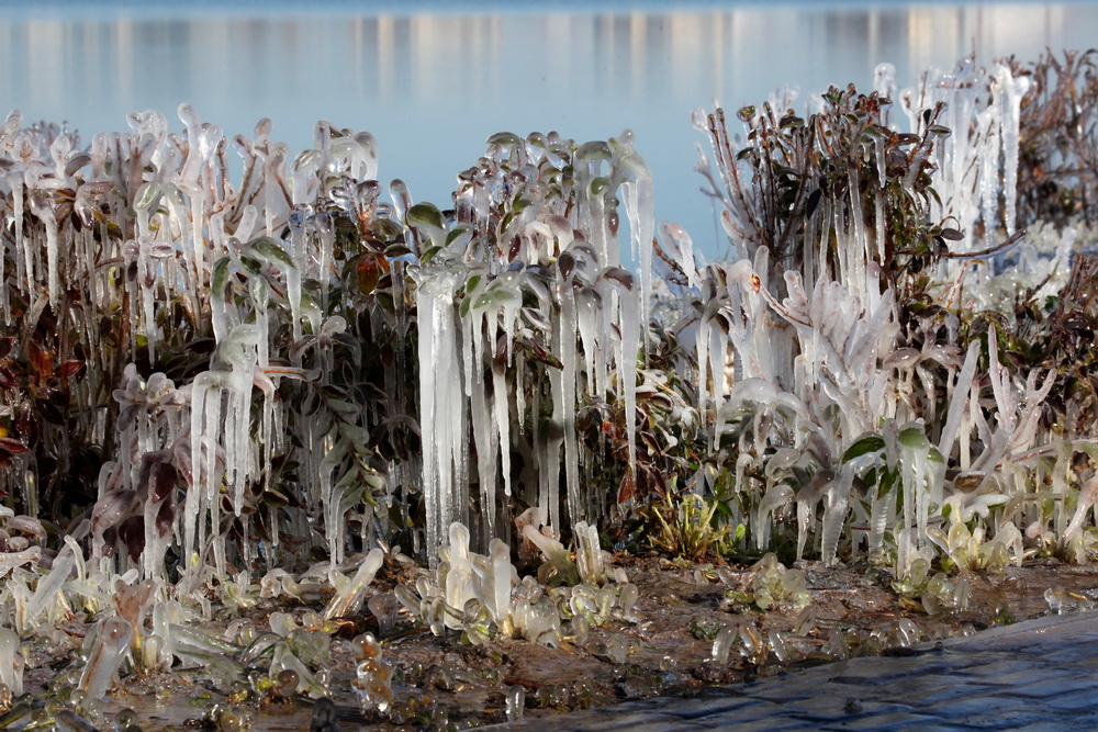 2015年10月31日,甘肅省張掖市,濱河新區(qū)受前一天強降雪天氣影響氣溫下降,正在灌溉的樹木、植被形成冰掛,玉樹瓊花美麗壯觀。