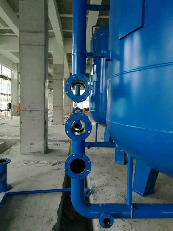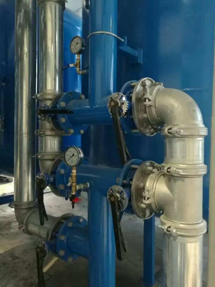 蘇州榮軒環保設計的這套自來水預處理設備,主要目的是去除原水中的懸浮物、膠體、有機物和余氯等妨礙后續反滲透運行的雜質,自來水首先進入砂濾罐:φ2.6m*4.4(總高),垂高2.0m,鋼板厚度10mm,級別Q235,內表面襯膠防腐5mm,外表面SA2.5級噴砂除銹至金屬光澤后,噴涂阿克蘇諾貝爾油漆。內部填充粗細粒徑石英沙,石英砂過濾器主要去除水中的懸浮物和膠體,水中大部分懸浮物和膠體在經過濾料截留而去除。